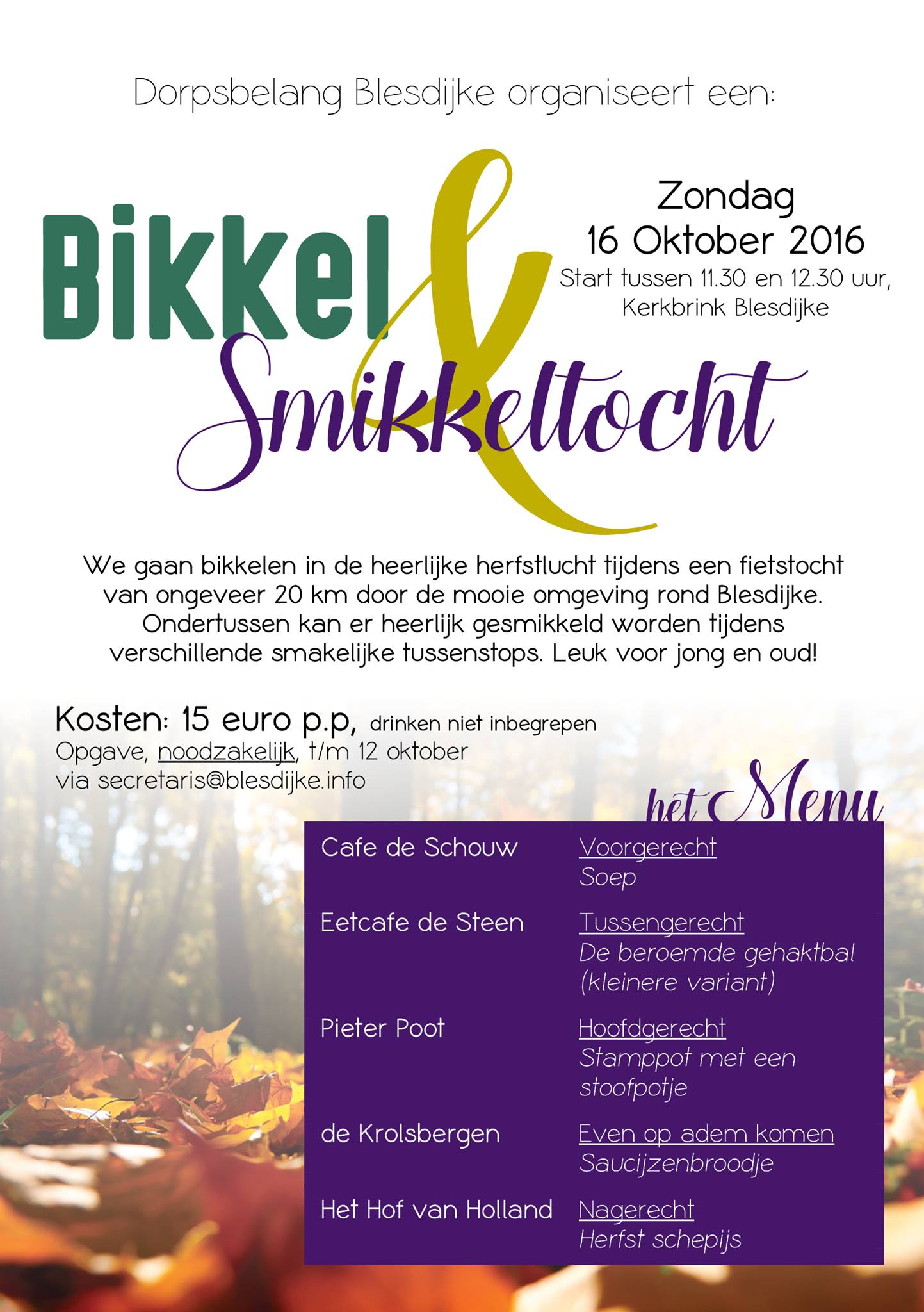 Voor iedereen! Dus ook voor fietsers buiten het dorp! Erg leuk voor jong en oud! Opgave NOODZAKELIJK t/m 12 oktober via secretaris@blesdijke.info